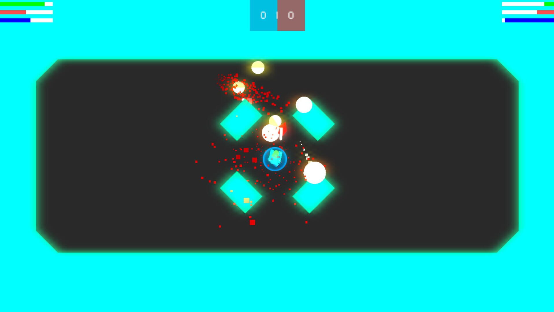 Bleeding Blocks is a 2D arena shooter. Two players face off in a single-screen deathmatch. Winning requires more than quick reflexes. Players must use cover and tactics to outsmart the enemy.
